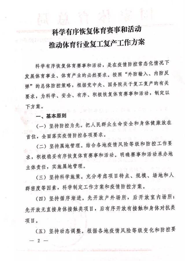 通知中写道,除了冬奥会测试赛等重要赛事之外,今年原则上不举办国际性体育赛事和活动。将分类推进,有序恢复体育赛事和活动。疫情风险处于中、高等级地区原则上暂不举办体育赛事和群体性全民健身活动。低风险地区在科学评估疫情风险,坚决贯彻防控要求的前提下,周密制定具体工作方案,经属地政府和疫情防控领导机制审核评估后组织实施,积极有序恢复体育赛事和活动。
